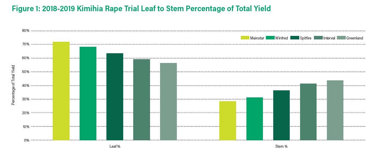 Spitfire and Mainstar forage rapes from Agricom are New Zealand-bred cultivars with very high utilisable yield for their types. Recent trials have confirmed that Spitfire and Mainstar have excellent yield in both their leaf and stem at the first grazing and have a high total yield when combined (see figure 1).